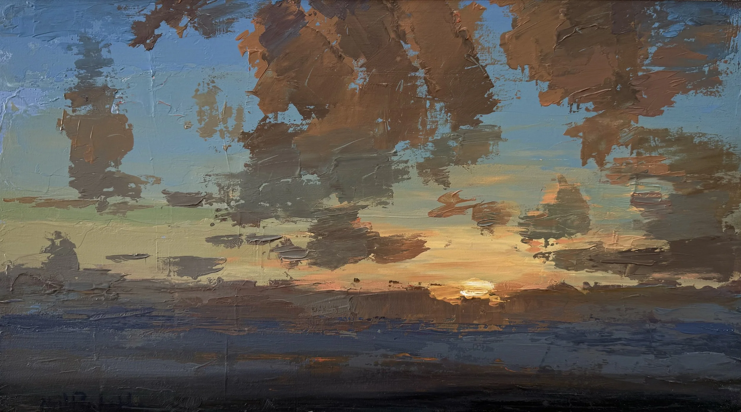 Neil works with a knife in order to express the forces of nature, the ever-changing elements, cloud formations, piercing blue skies over acres of red bracken and the raw beauty of the landscape. The natural progression towards paintings on a greater scale is leading to an exploration of larger landscapes further afield.