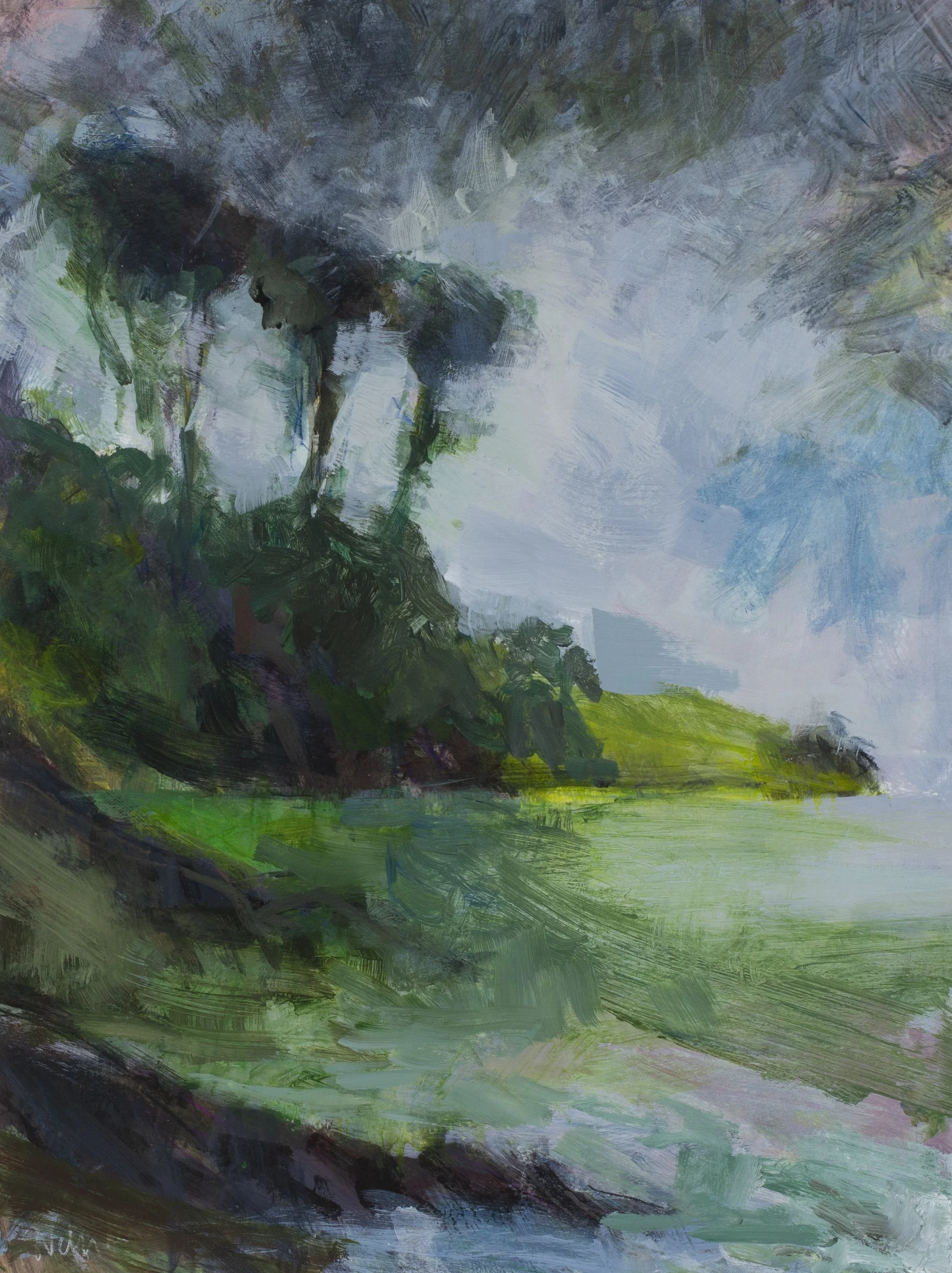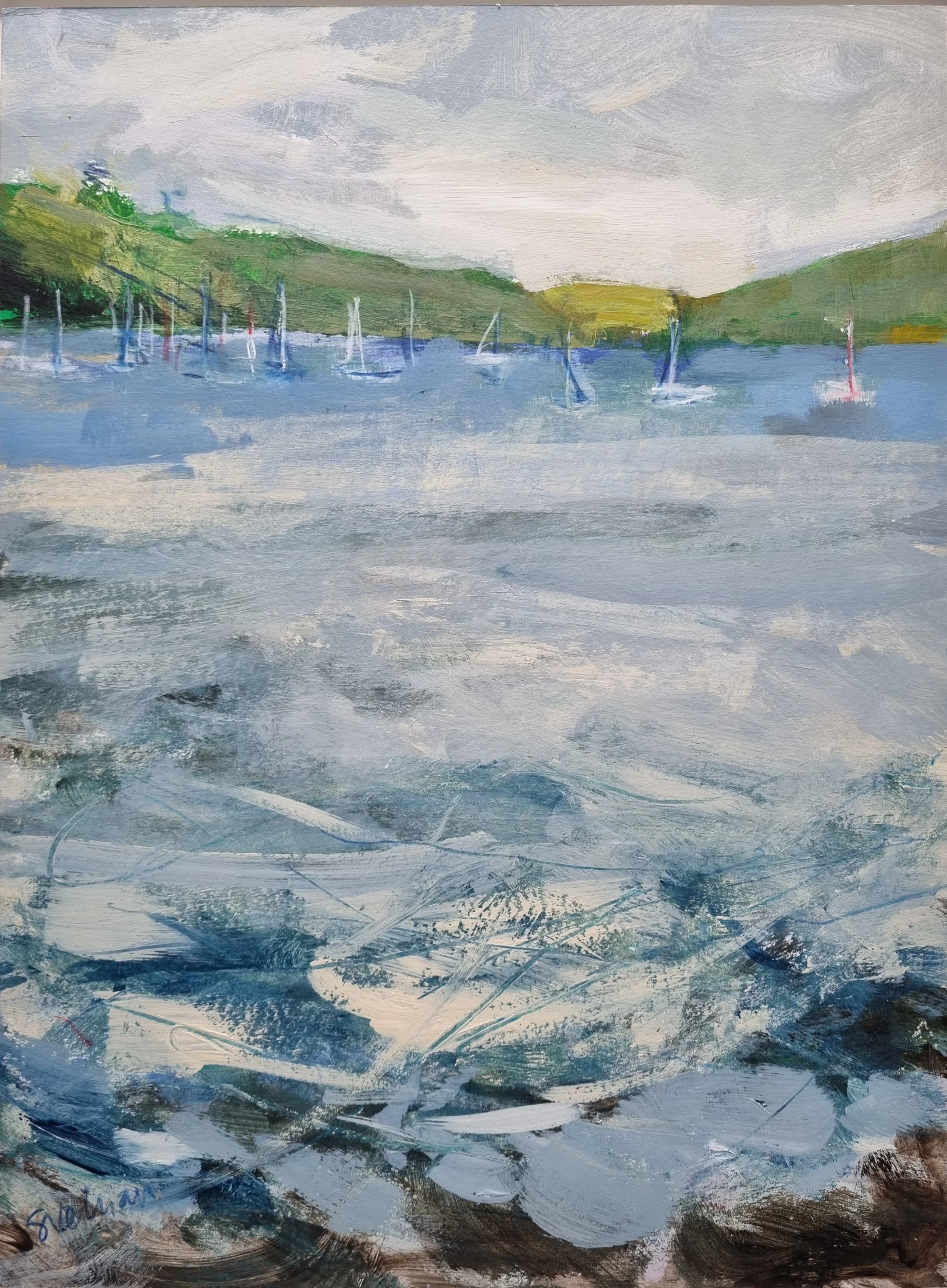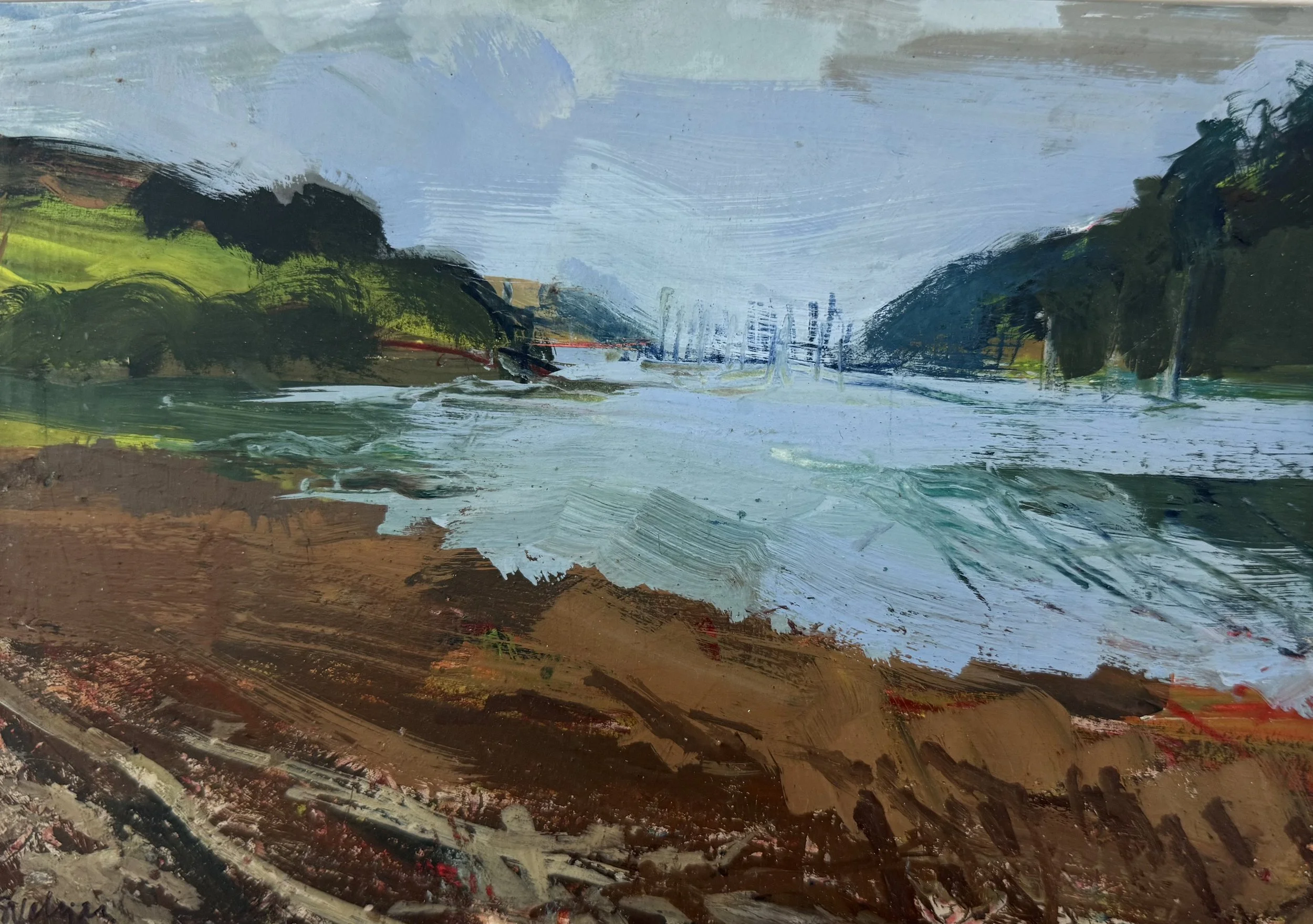 Her paintings are luminous and expressive, full of emotion and depth. Working in her studio, she builds up the layers of richly pigmented paint and wax over time, creating a history of marks in the layers with drips, solvent wiping and scratches, evoking a sense of movement and atmosphere. Inspiration comes from early morning walks with her rescue dog on the Helford beaches and from swimming in the cold water, especially at sunrise. The colours of dawn, especially the tangerines and blush pinks, are her signature palette. Her goal is to convey the essence and emotion of the places she paints, and to share her love of this unique landscape and the sheer joy of painting with the viewers.